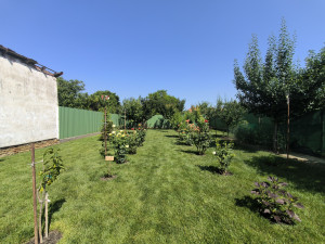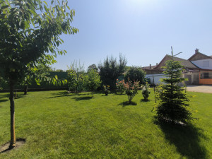 Az udvarba elektromos mozgatású nagykapun keresztül juthatunk be, ahol akár három személyautó elhelyezésére alkalmas garázsok találhatóak. A parkosított kertben termő gyümölcsfák és szőlő került telepítésre, melyek öntözéséhez fúrt kút biztosít vizet.