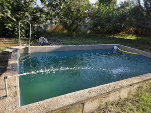 Az 1026 m2-es tágas telek bőséges teret biztosít kertészkedéshez, teret ad a medencének, ami vasbeton szerkezetű, belül festett felületű, a mérete 5,2 x 3,0 x 1,3 méter.