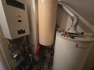 A fűtés gáz központi, radiátor hőleadókkal, a melegvizet gáz vízmelegítő (külön készülék) biztosítja, illetve a nappaliban fatüzelésű cserépkályha található kiegészítő fűtésként.