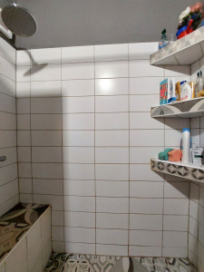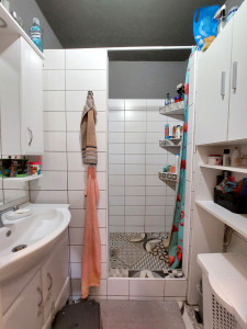 -  Zuhanyzós, átalakított fürdő – a modern fürdőszoba helytakarékos kialakítású, igényes burkolatokkal, a mindennapi kényelmet szolgálva.